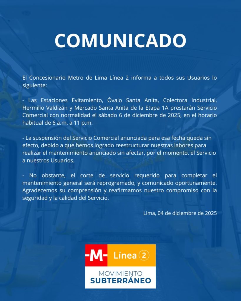 Tras alcanzar 97 % de satisfacción entre sus usuarios de la Etapa 1A. La Línea 2 del Metro de Lima y Callao registra un 97 % de satisfacción general (CSAT) entre sus usuarios, de acuerdo con la Segunda Medición de Satisfacción del servicio realizada en octubre de 2025. Esta cifra supera el 94 % obtenido …