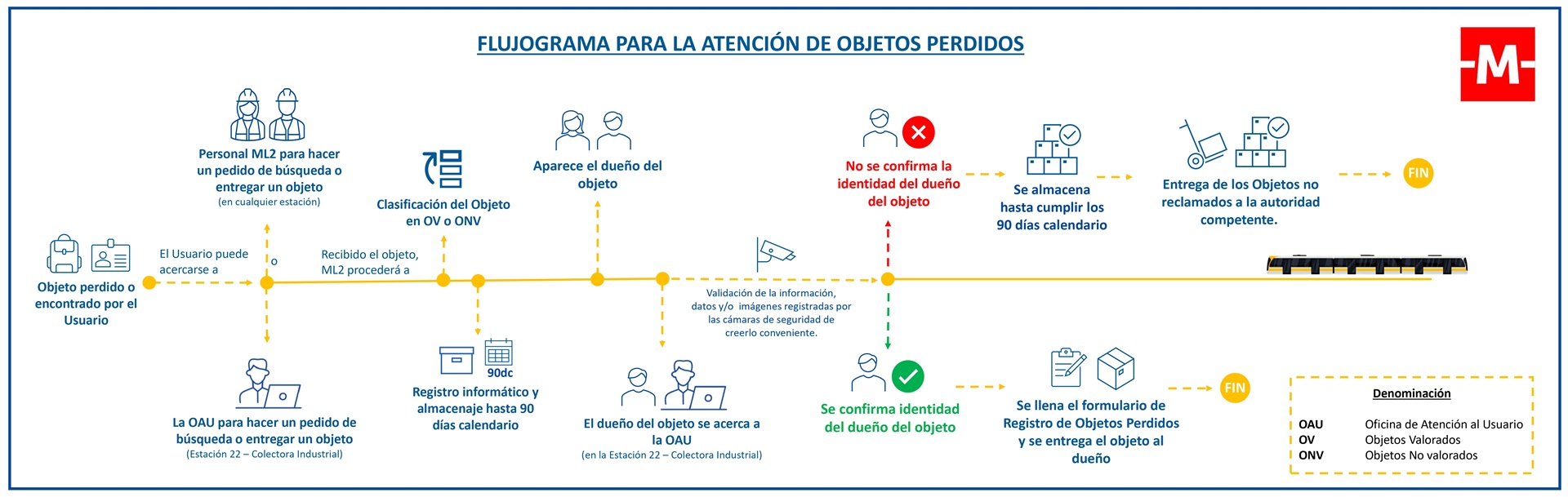 En caso algún usuario del Metro busque o encuentre algún objeto perdido en las estaciones o trenes, podrá acercarse a la Oficina de Atención al Usuario, ubicada en la Estación 22 Colectora Industrial (Carretera Central en su cruce con la Av. Colectora Industrial), en la cual se custodiarán los objetos encontrados en las instalaciones, durante un máximo de 90 días contados a partir de su recepción.